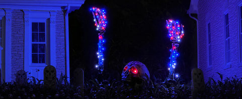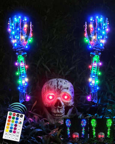 Halloween Lighted Skeleton Set, Realistic Skeleton Head with Light Up Eyes + Skull Arm Stakes + 1x Remote Colored Lights + 1x Green Lights, Outdoor Halloween Decorations for Party