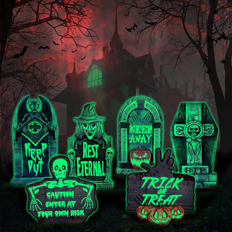 Halloween Tombstone Yard Decorations - 6 Uniquely Styled Fluorescent Graveyard Tombstone Props - Outdoor Lawn Party Decoration with 12 Ground Stakes for Halloween Party|Garden|Yard