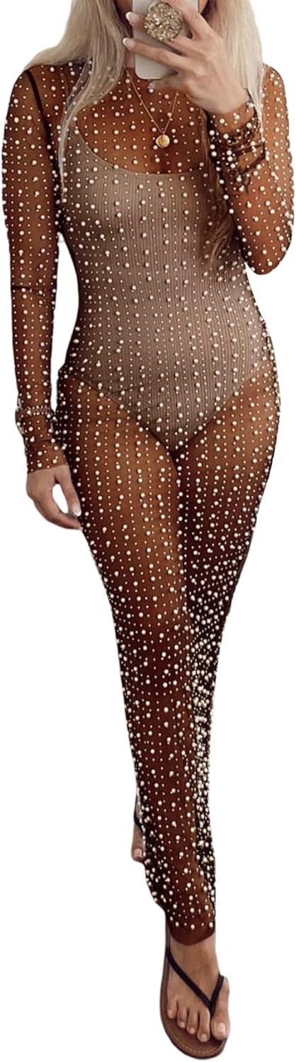 Sheer Mesh Pearl Rhinestone Cover Up Dress Beach Swimwear Bikini Bathing Suit Cover Ups