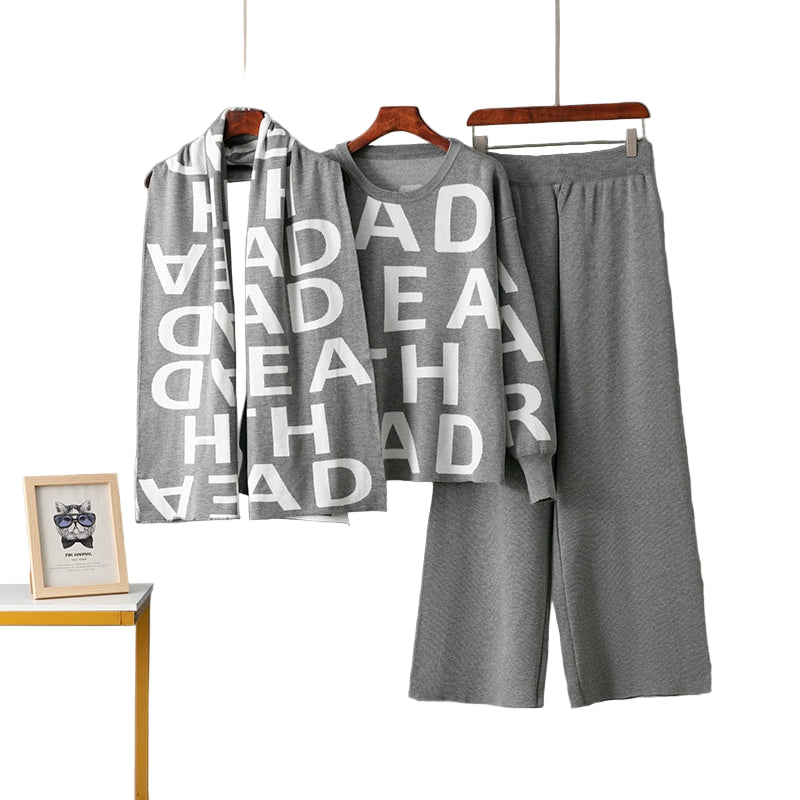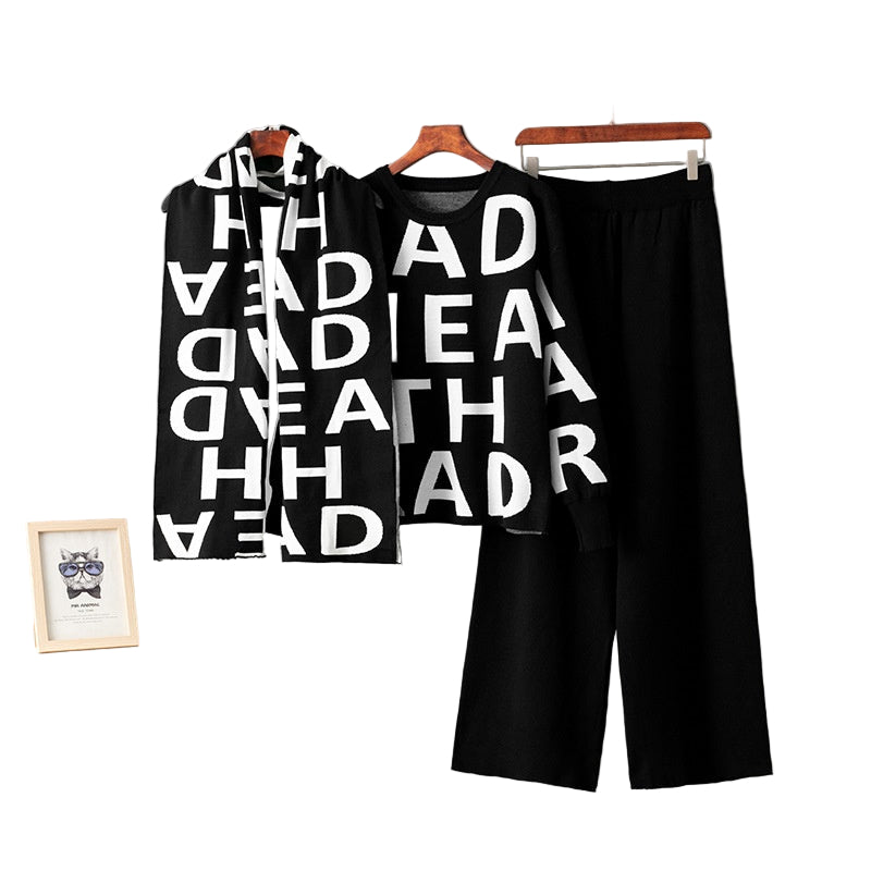 Elegant Women’s Knitted Suit – Letter Shawl, Woolen Round Neck Top & Casual Wide-Leg Pants