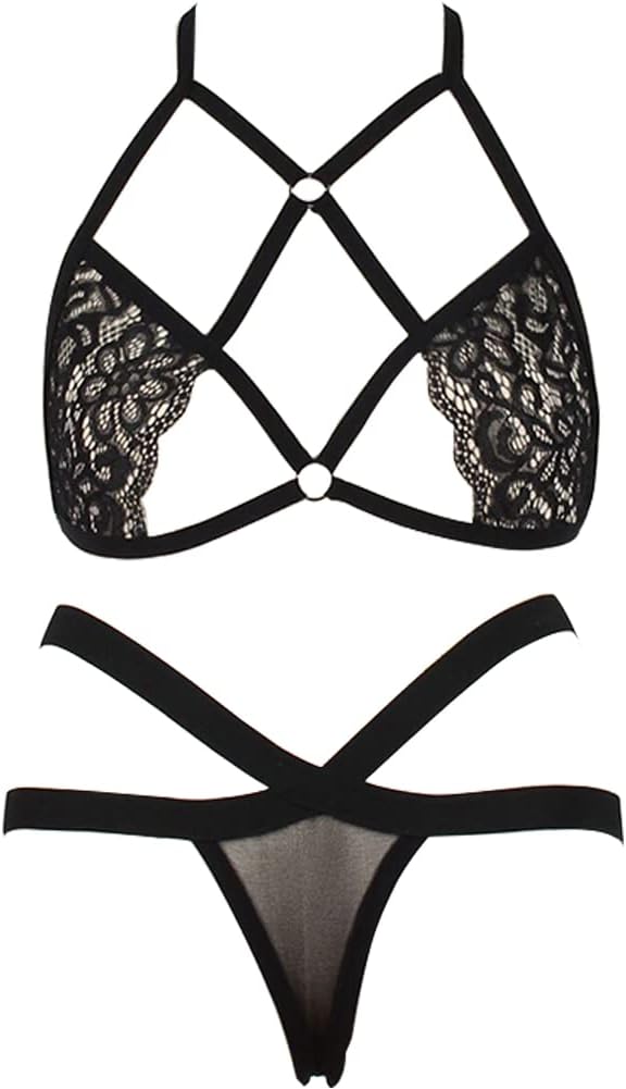 Lace Lingerie Set Women Strappy Bra and Panties Set Elastic Cage Straps Bralette Top Strappy See Through Knicker Party Outfit for Halloween Valentine Gift Black