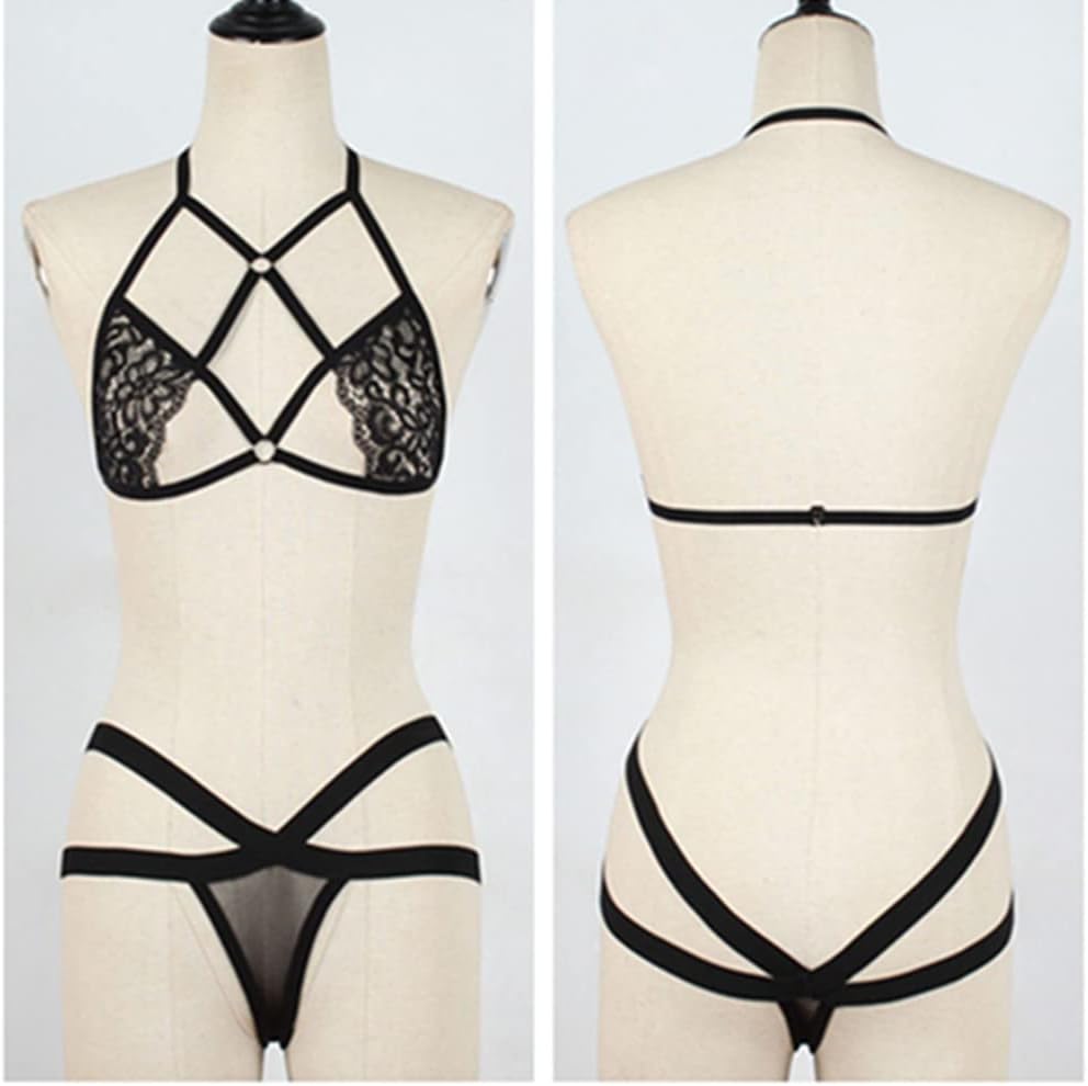 Lace Lingerie Set Women Strappy Bra and Panties Set Elastic Cage Straps Bralette Top Strappy See Through Knicker Party Outfit for Halloween Valentine Gift Black - S-M / Black is backordered. It will be shipped when back in stock.