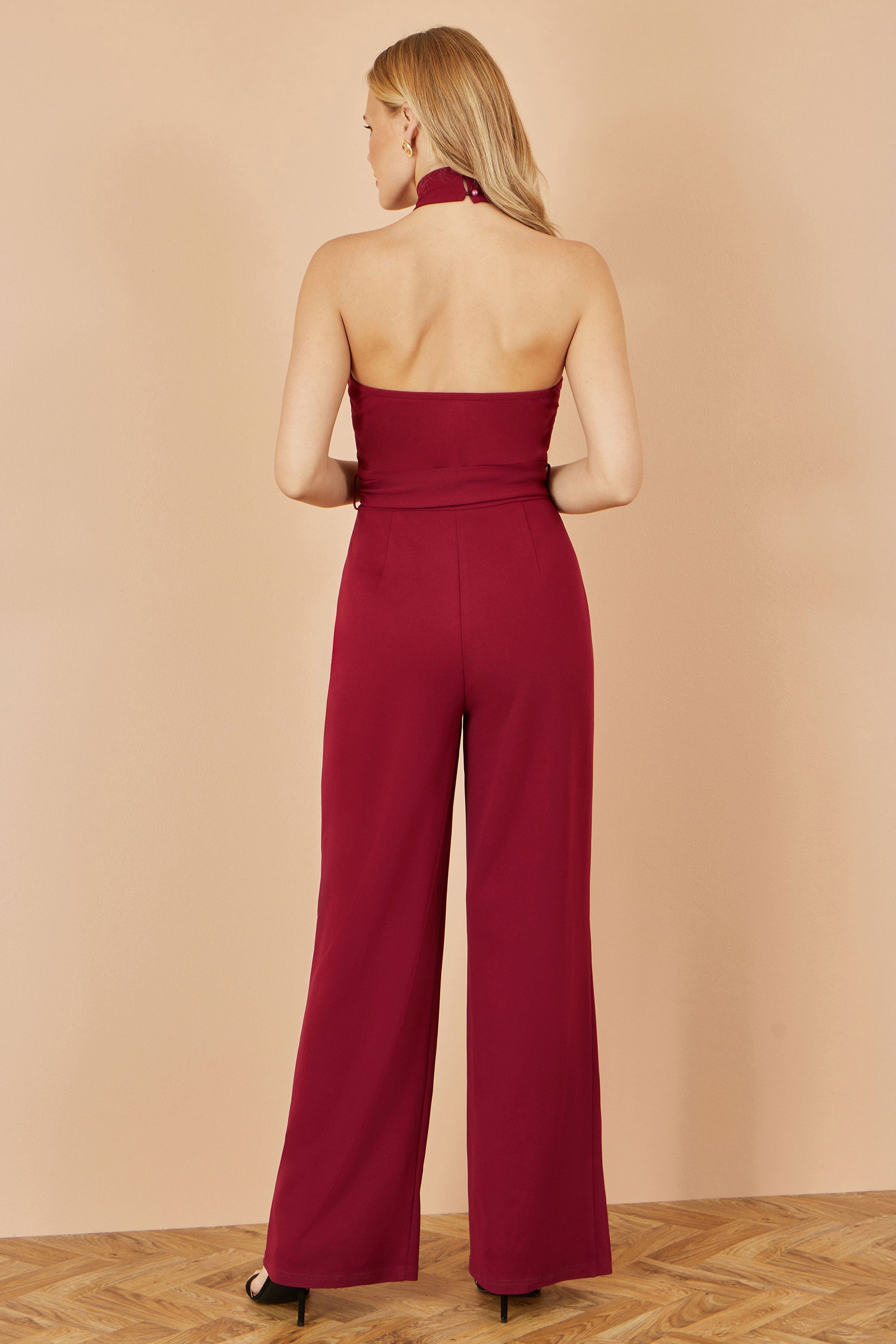 Yumi Burgundy Cross Over Halter Neck Jumpsuit