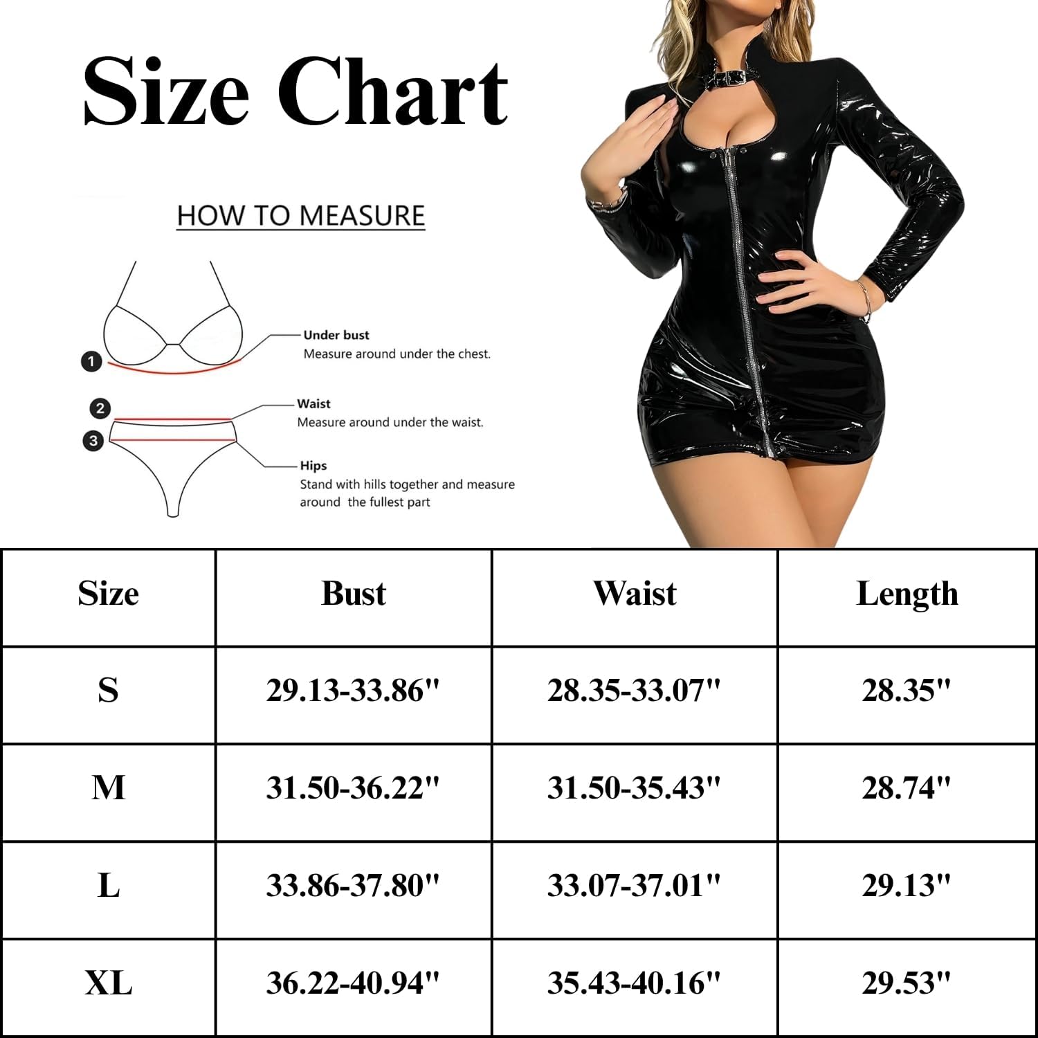✨Size and Color: This bodycon latex dress is available in black and red. There are four sizes to choose from; you can choose the appropriate size according to your situation and match it with the size chart.