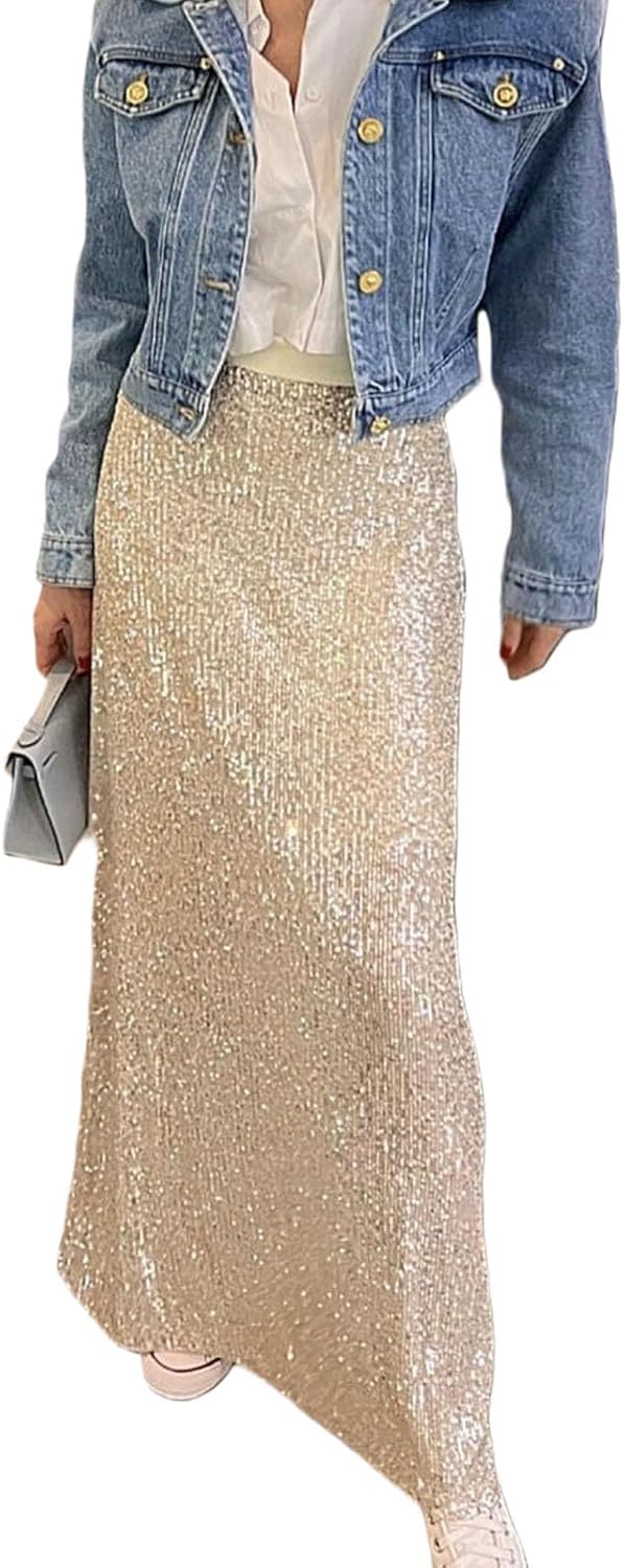 Sequin Skirt, Sparkly Stretchy Bodycon Midi Glitter Skirt Party Night Out Clubwear