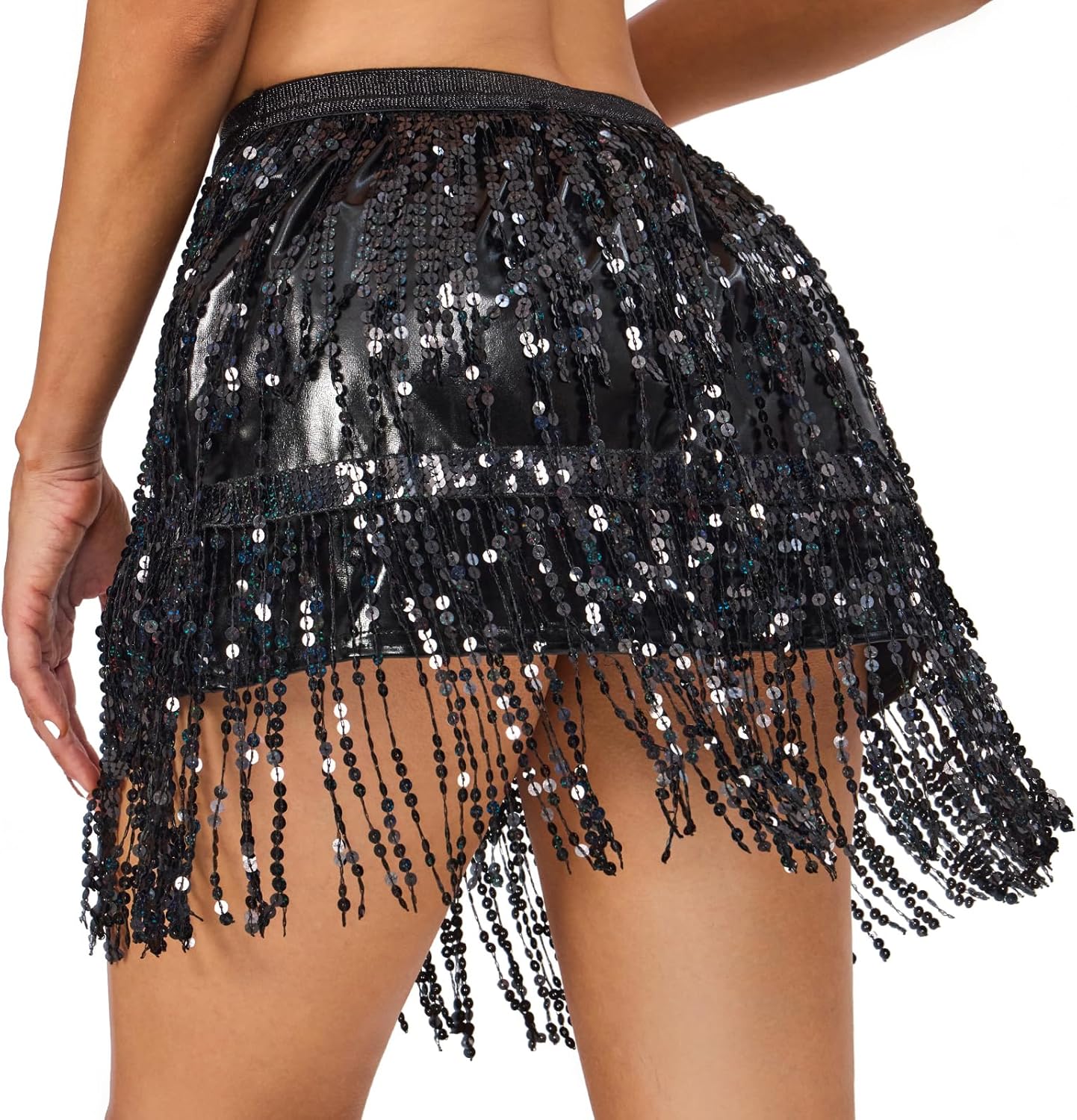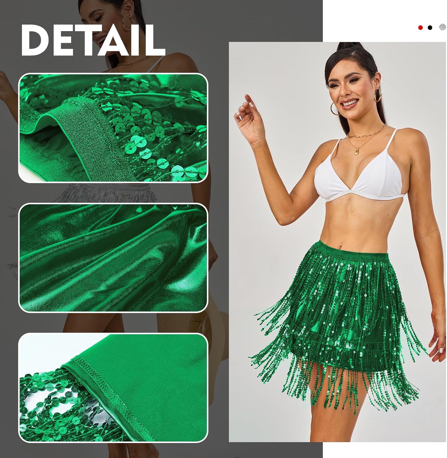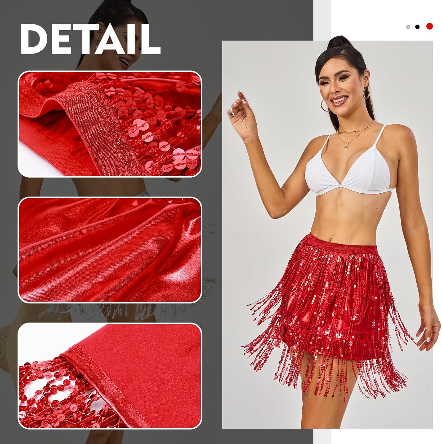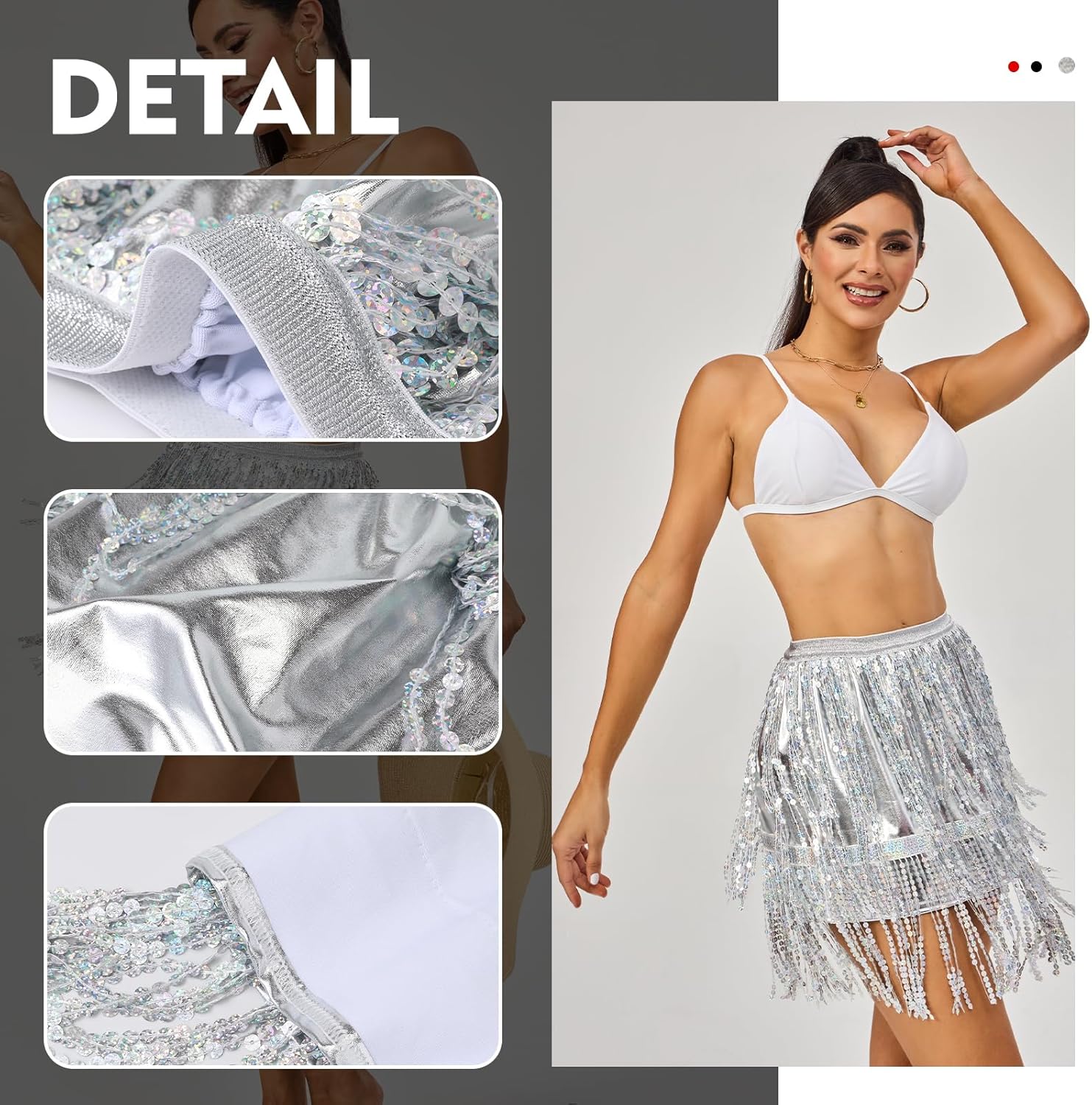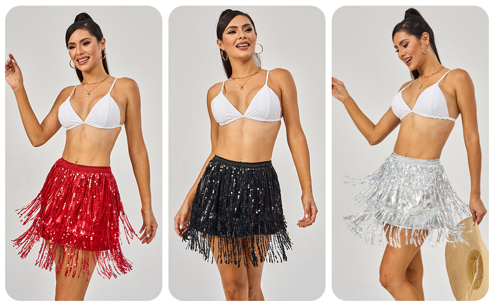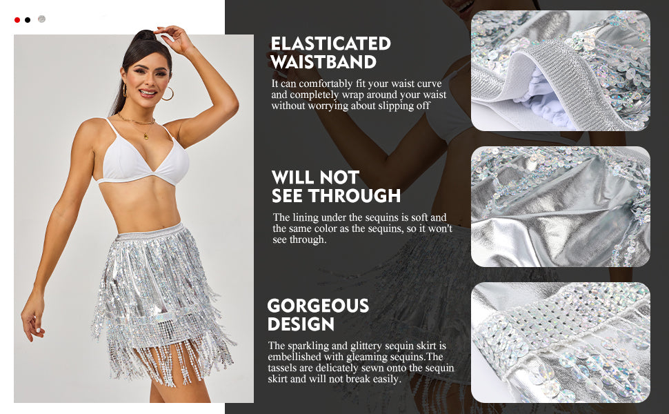 Comfortable Material: Our sequin tassel skirt is made of polyester and spandex, which is lightweight and comfortable to wear. The lining underneath the sequins is soft and comfortable, covers your hips completely and is the same colour as the sequins and has a certain thickness so it won't be see-through. The tassels are delicately sewn onto the sequin skirt and will not break easily.