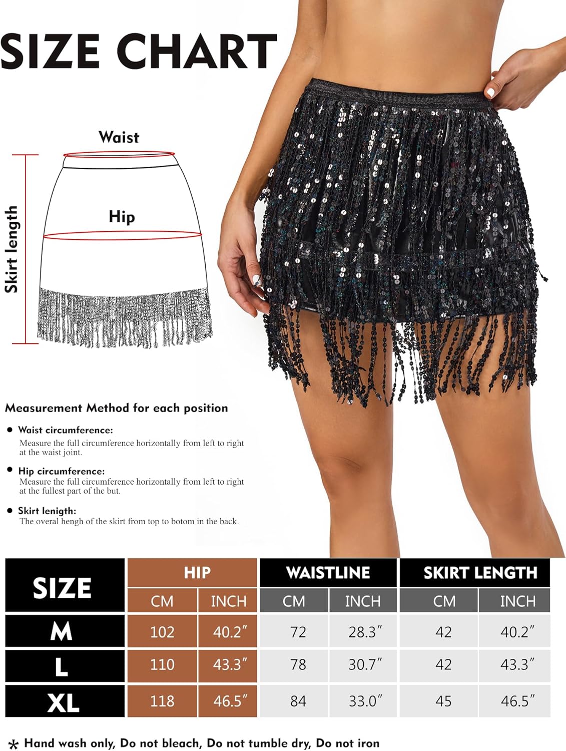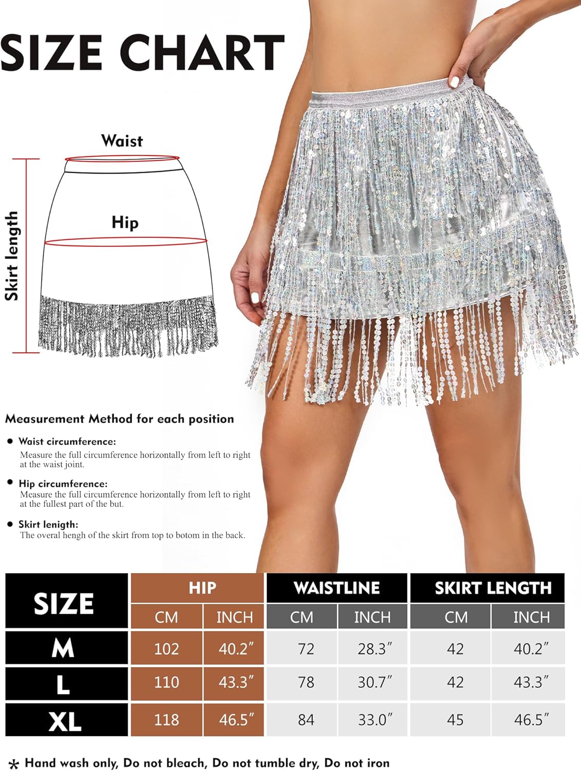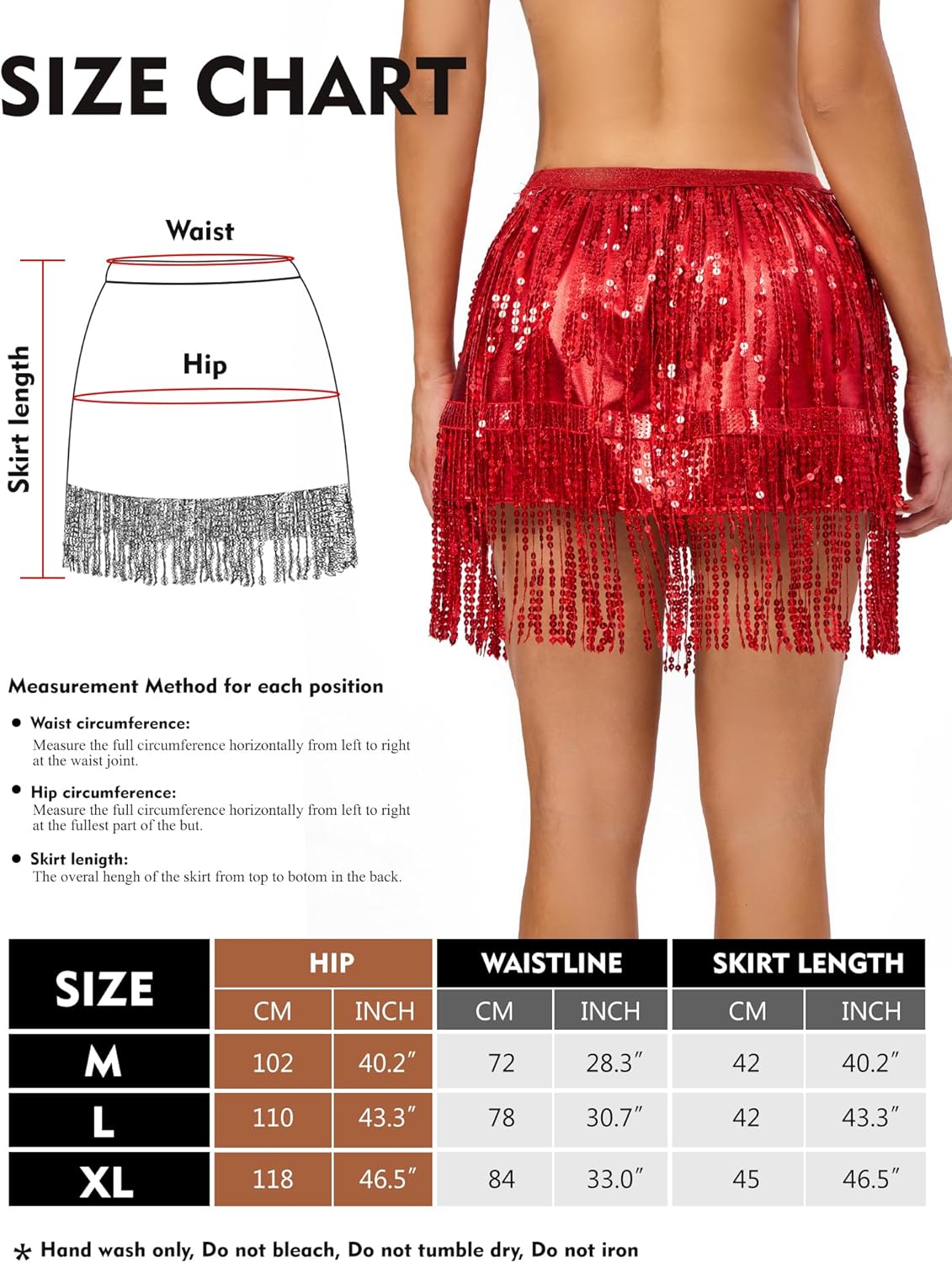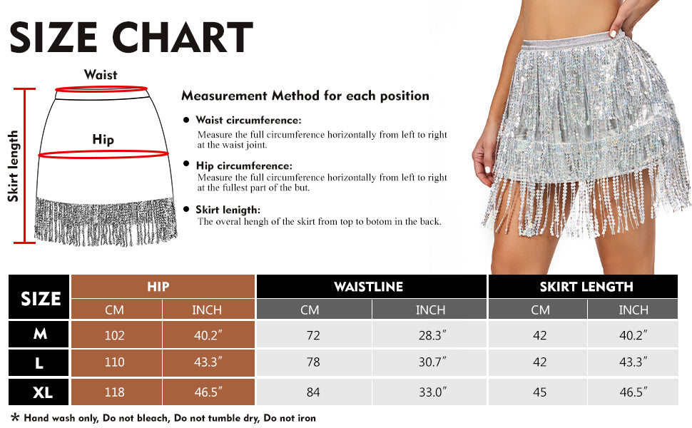 Multiple Sizes: Different from most one-size sparkly skirts, these tassel skirt are available in 3 colours and 3 sizes: silver, black and red. In order to get the most suitable skirt for your hip size, please refer to the size chart in the picture to choose the size as it provides detailed information about the length and other measurements.