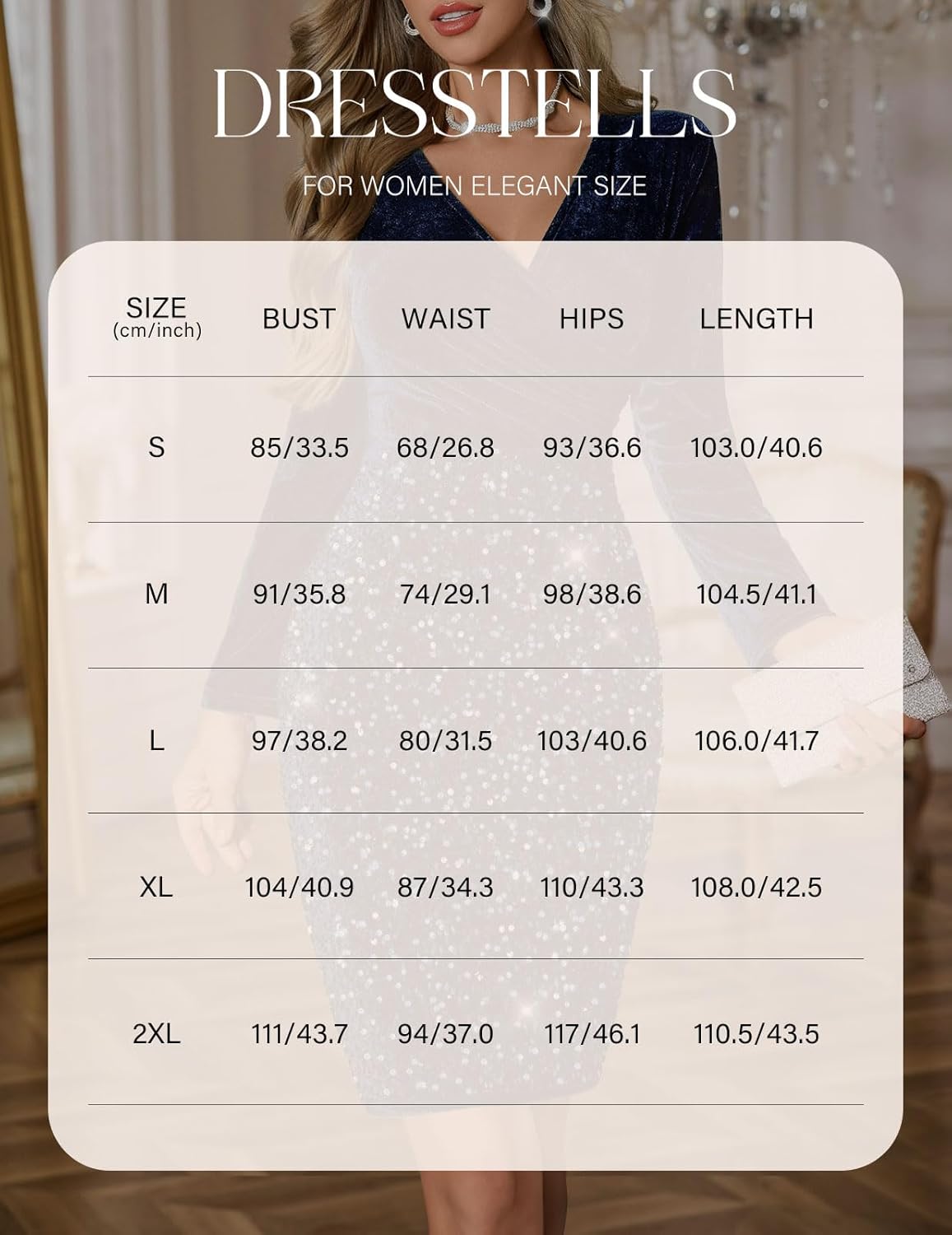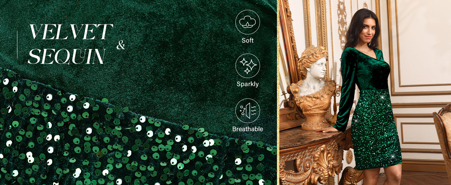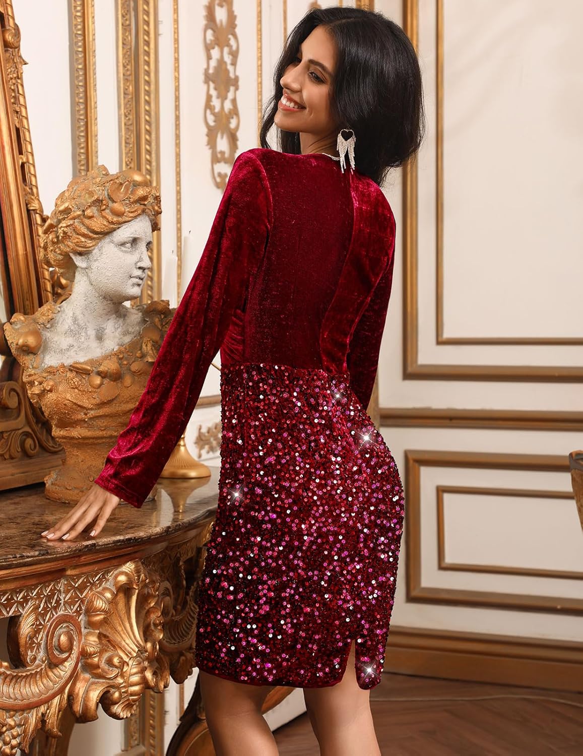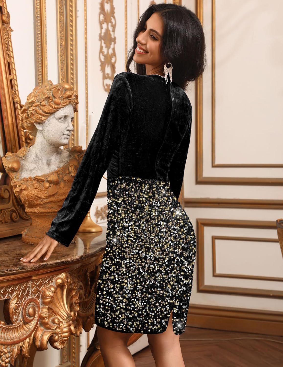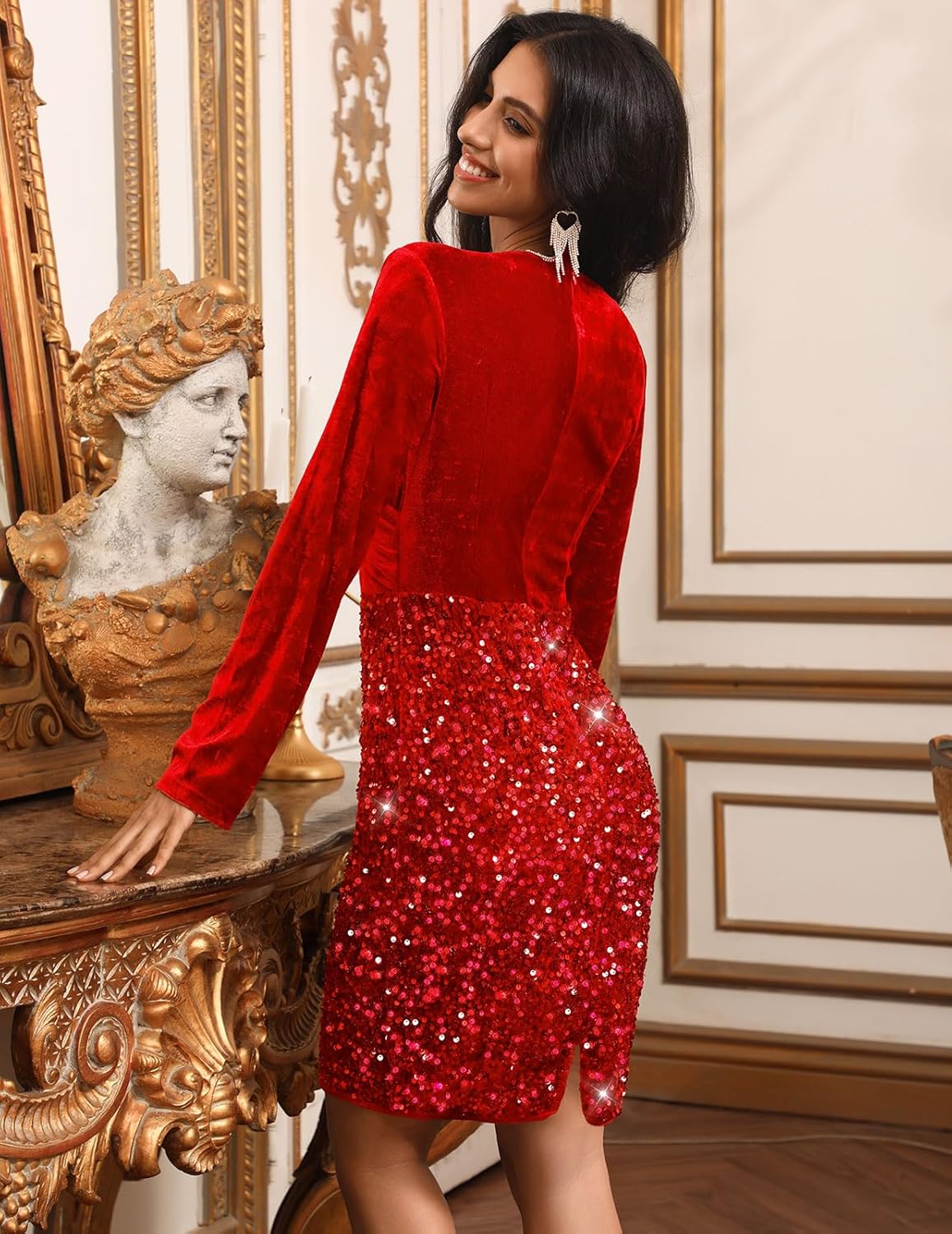 Velvet Sequin Cocktail Dress, Sparkly Winter Holiday Party Evening Long Sleeve Bodycon Dresses