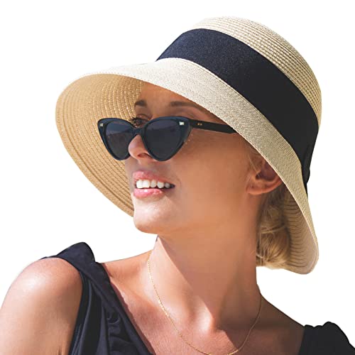 FURTALK Sun Hats for Women Men, Adjustable Summer Panama Fedora Wide Brim Hat UV UPF 50+,Foldable Packable Straw Beach Hat Beige