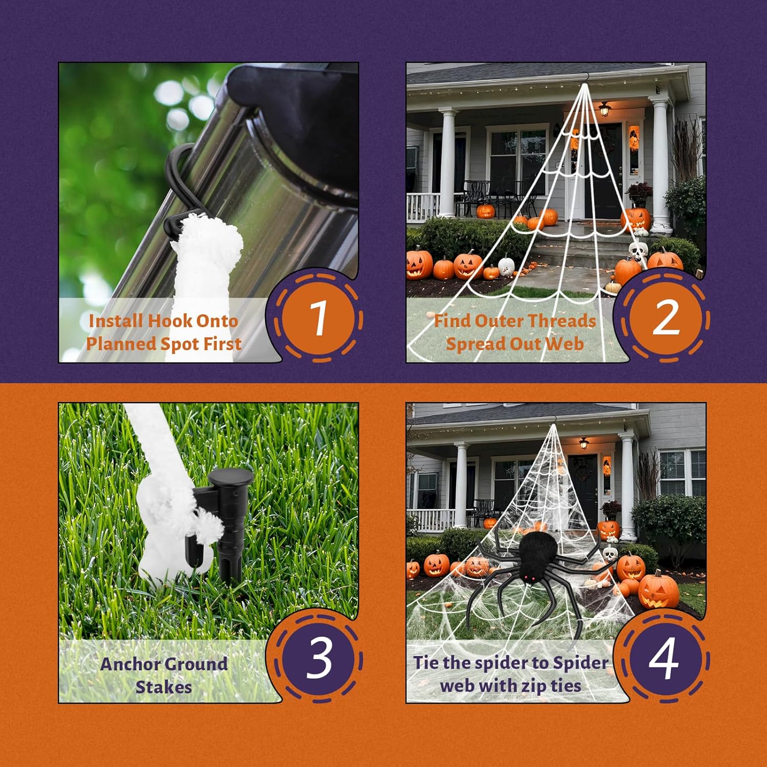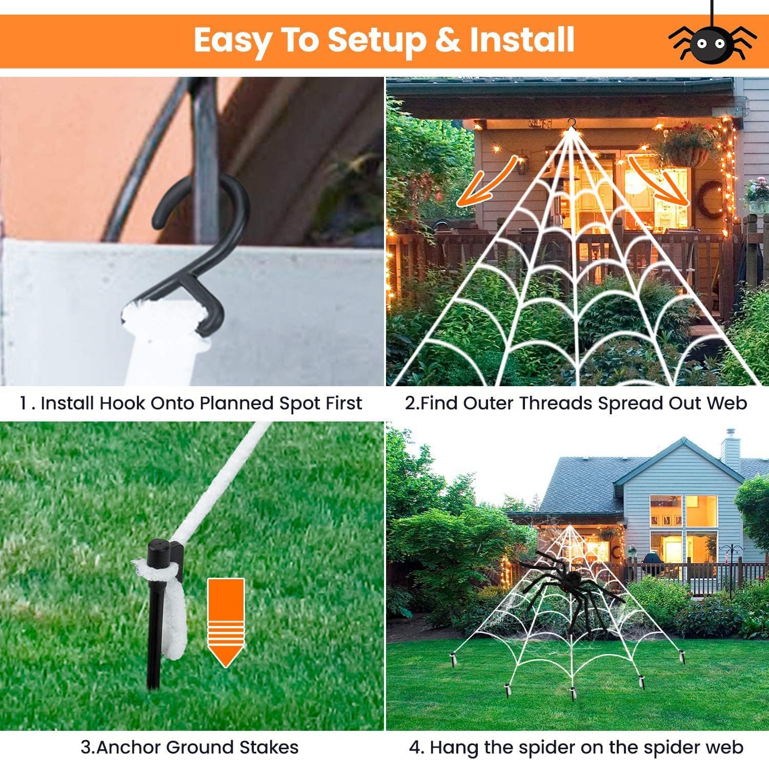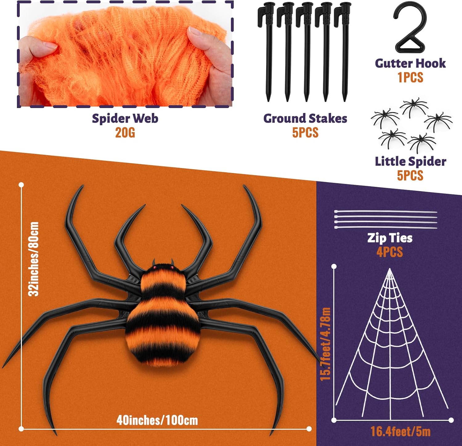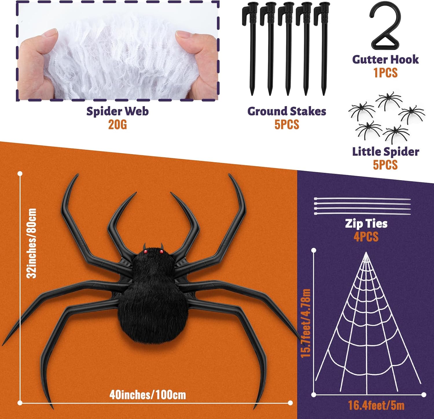 - 【Giant Spider Web Set for Halloween Decorations】1 Triangle Giant spider web (16.4ft*15.4ft) + 1 Huge Halloween colorful spiders...