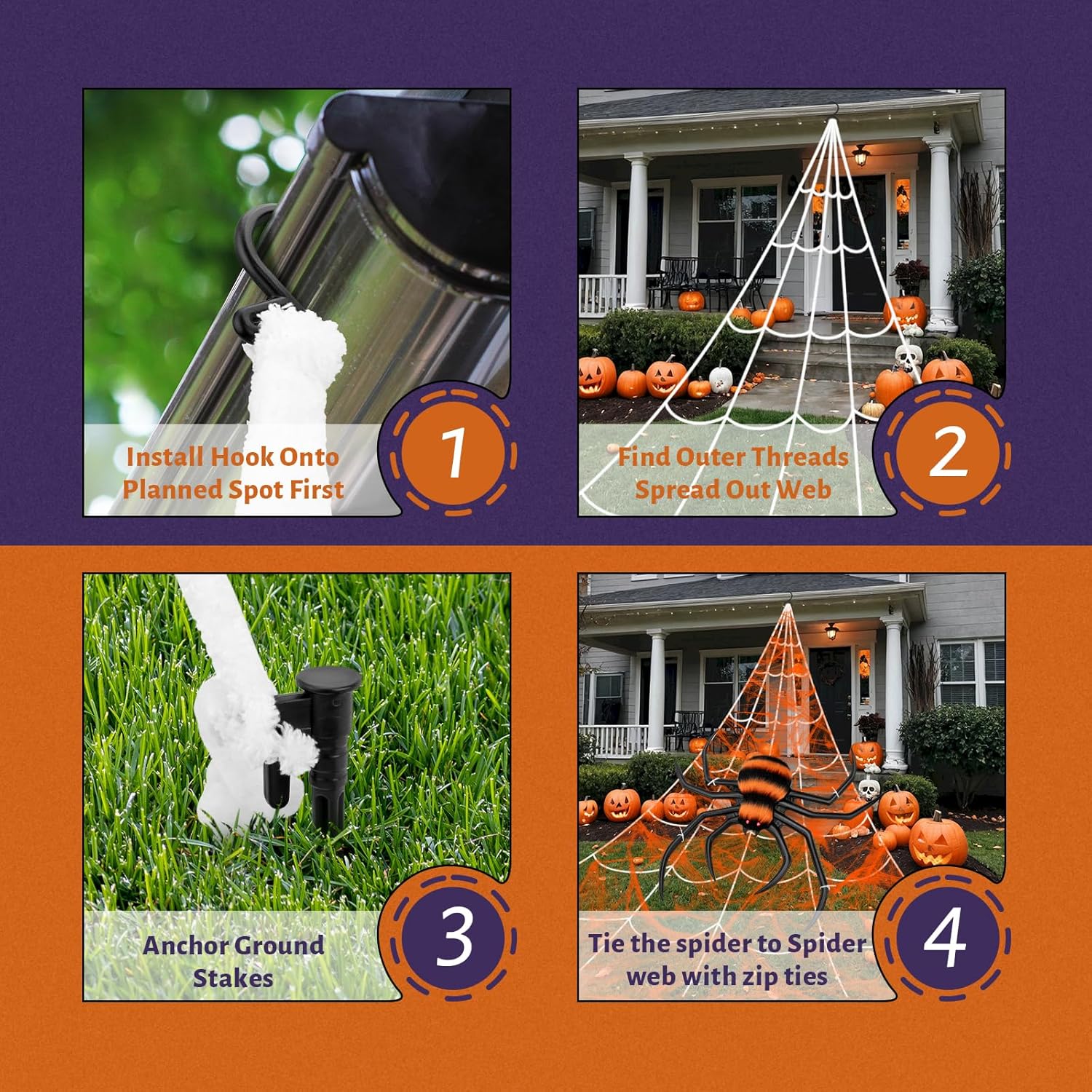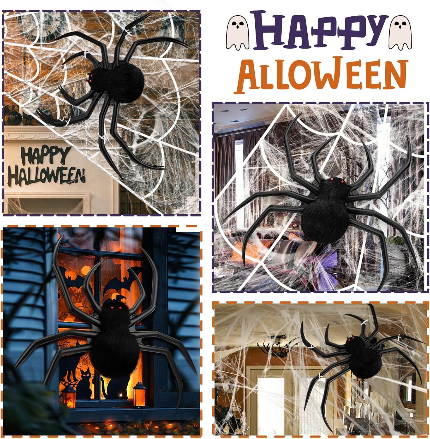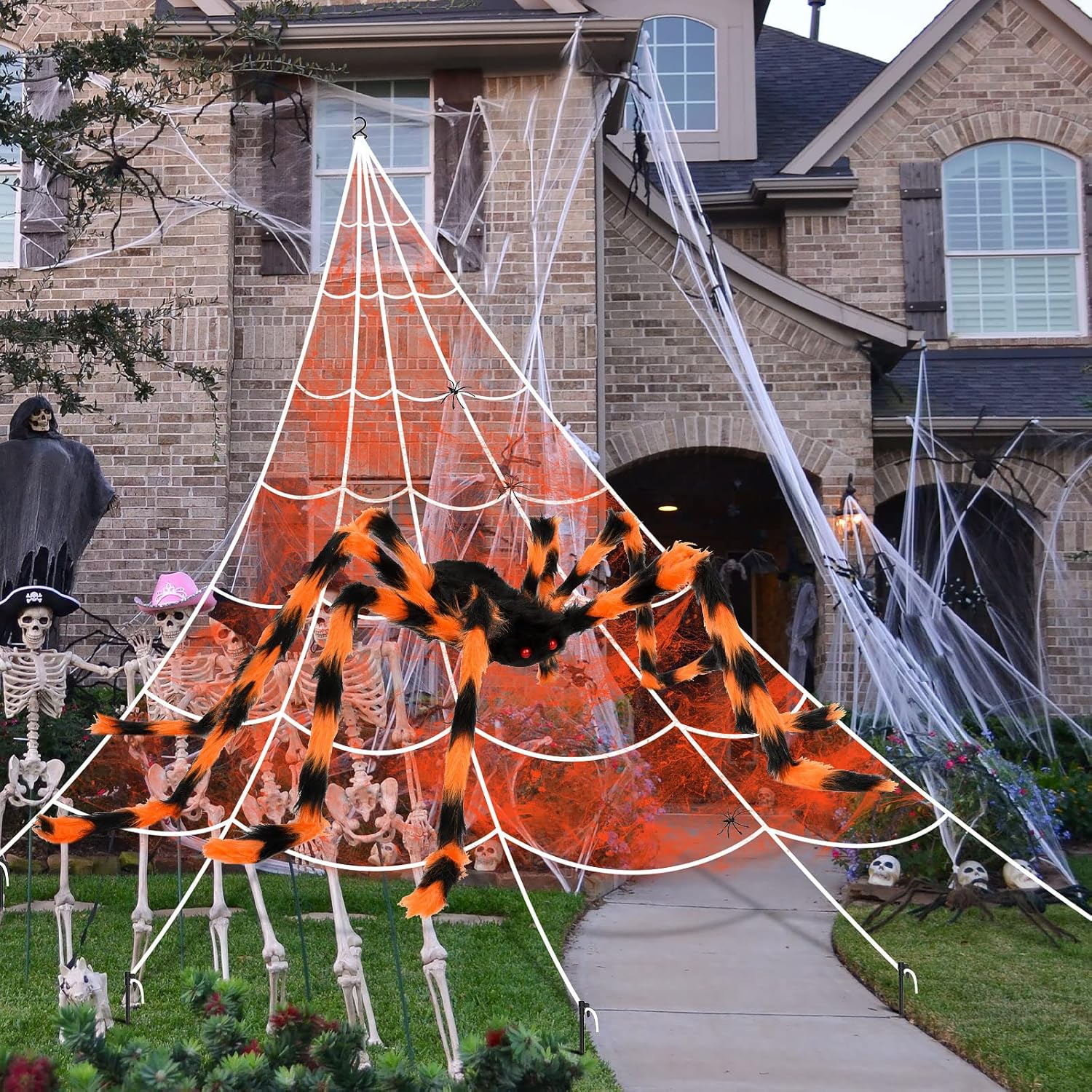 - 【Giant Spider Web Set for Halloween Decorations】1 Triangle Giant spider web (16.4ft*15.4ft) + 1 Huge Halloween colorful spiders...