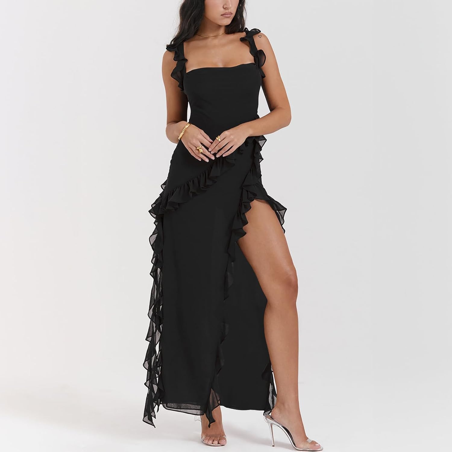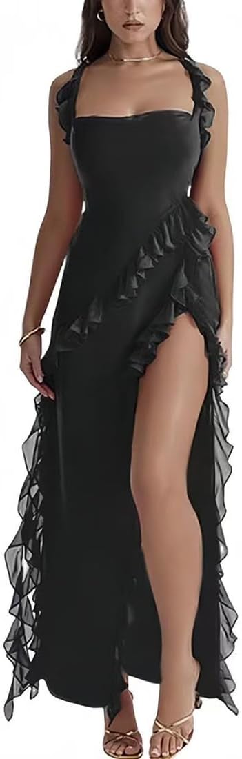 Maxi Dress Sexy Sleeveless Long Dresses Sqaure Neck High Slit Prom Dress Elegant Backless Ruffle Hem Bodycon Evening Dresses for Party Cocktail Club Wedding Formal - S / Black is backordered. It will be shipped when back in stock.