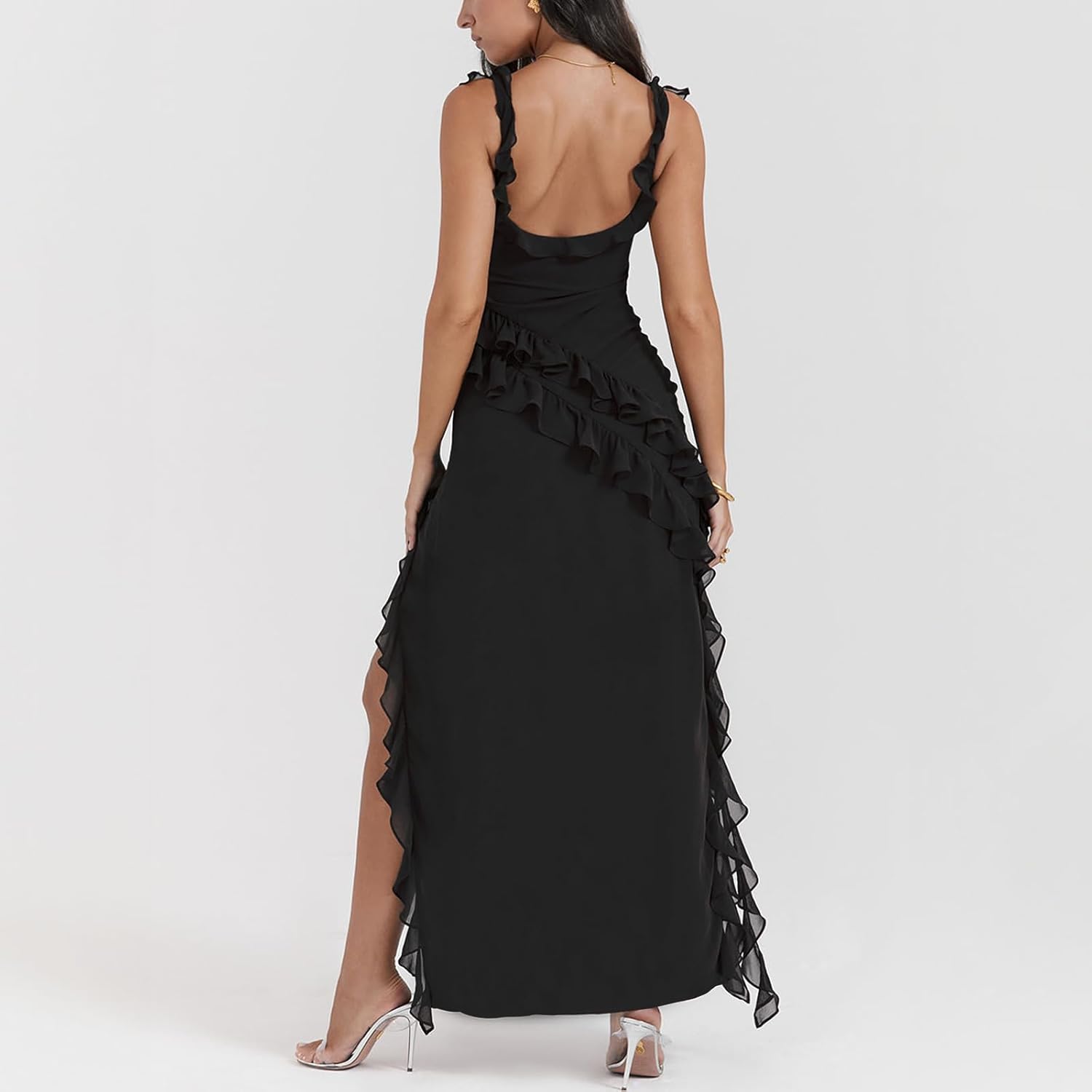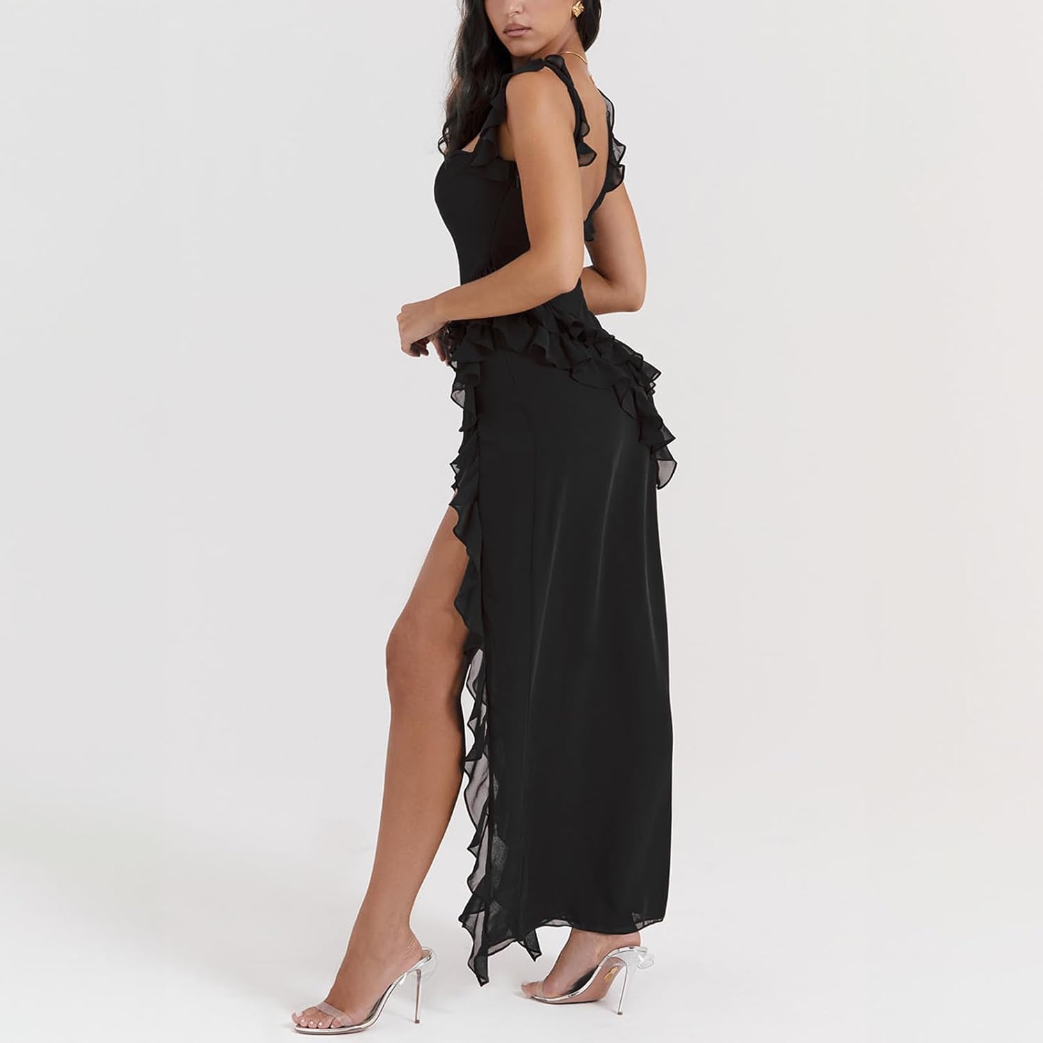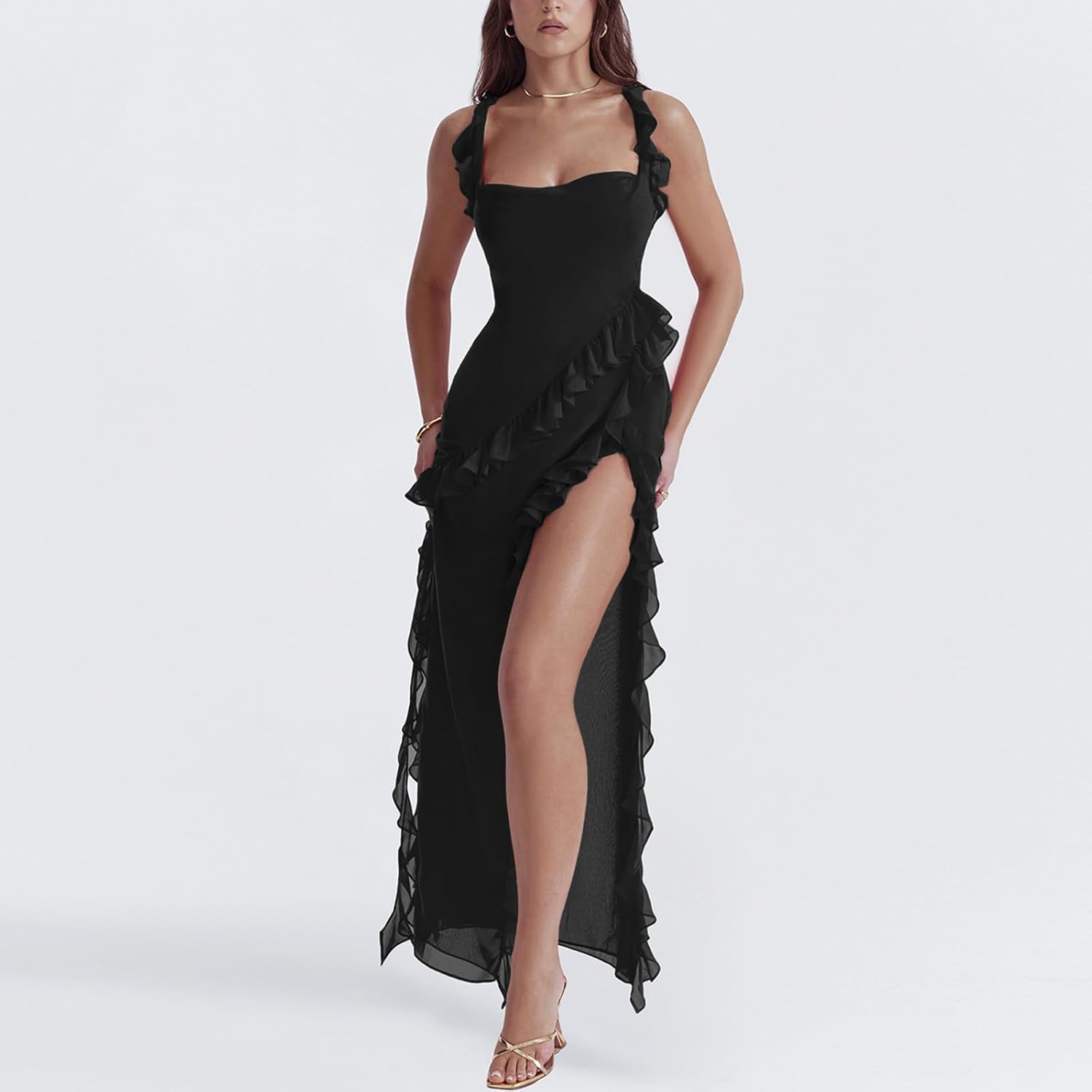 Maxi Dress Sexy Sleeveless Long Dresses Sqaure Neck High Slit Prom Dress Elegant Backless Ruffle Hem Bodycon Evening Dresses for Party Cocktail Club Wedding Formal