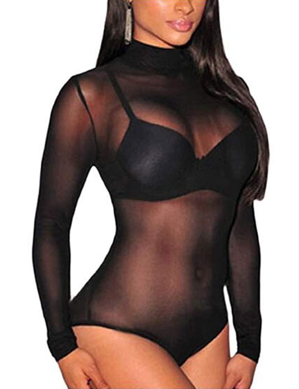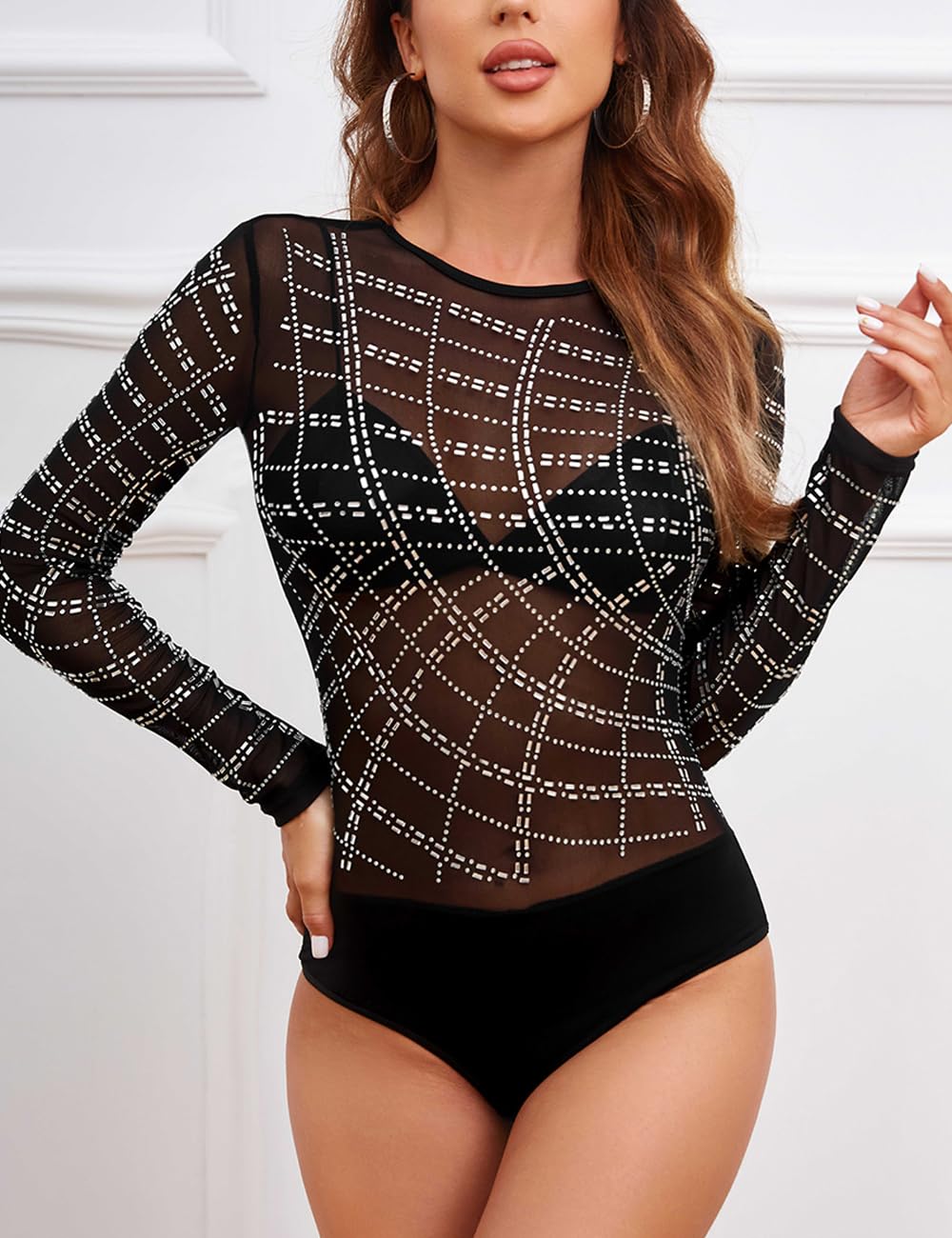 MAYFASEY Women Sexy Mesh Long Sleeve Rhinestone Leotard Top Jumpsuits Clubwear Bodysuit
