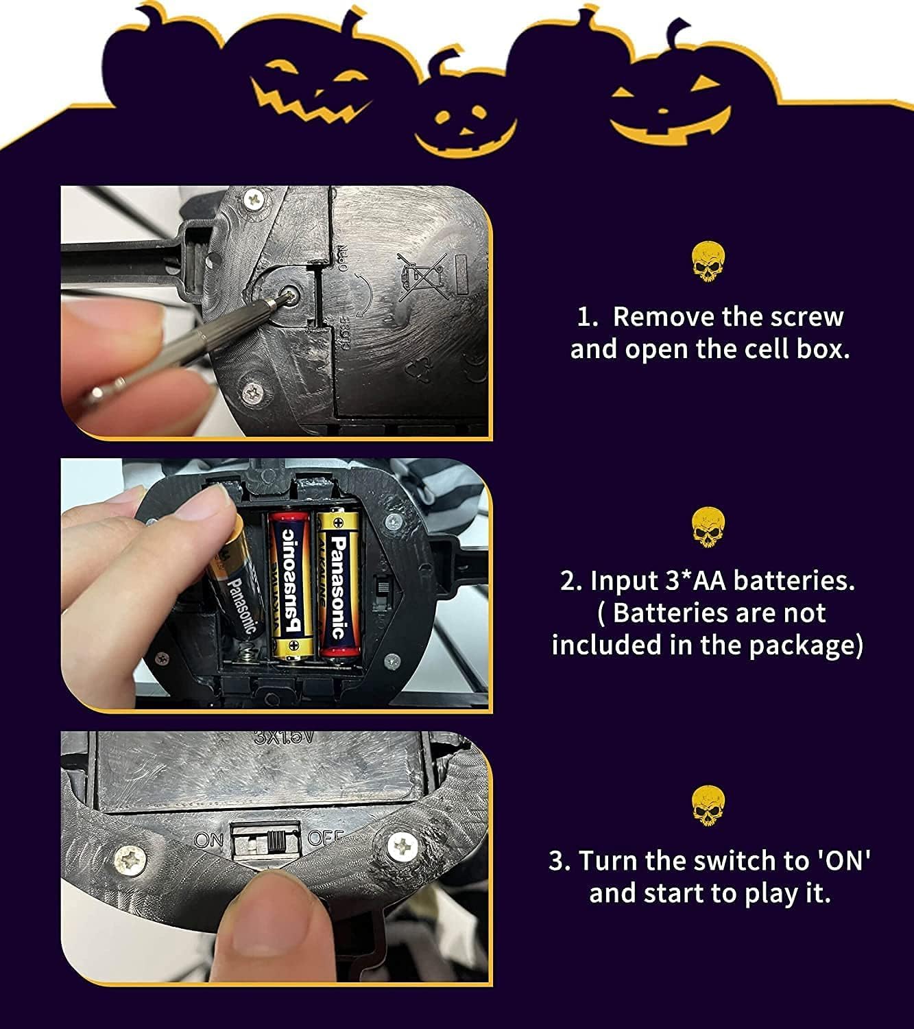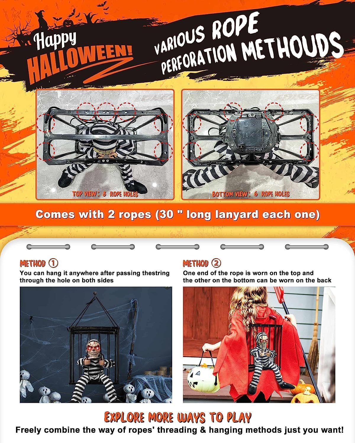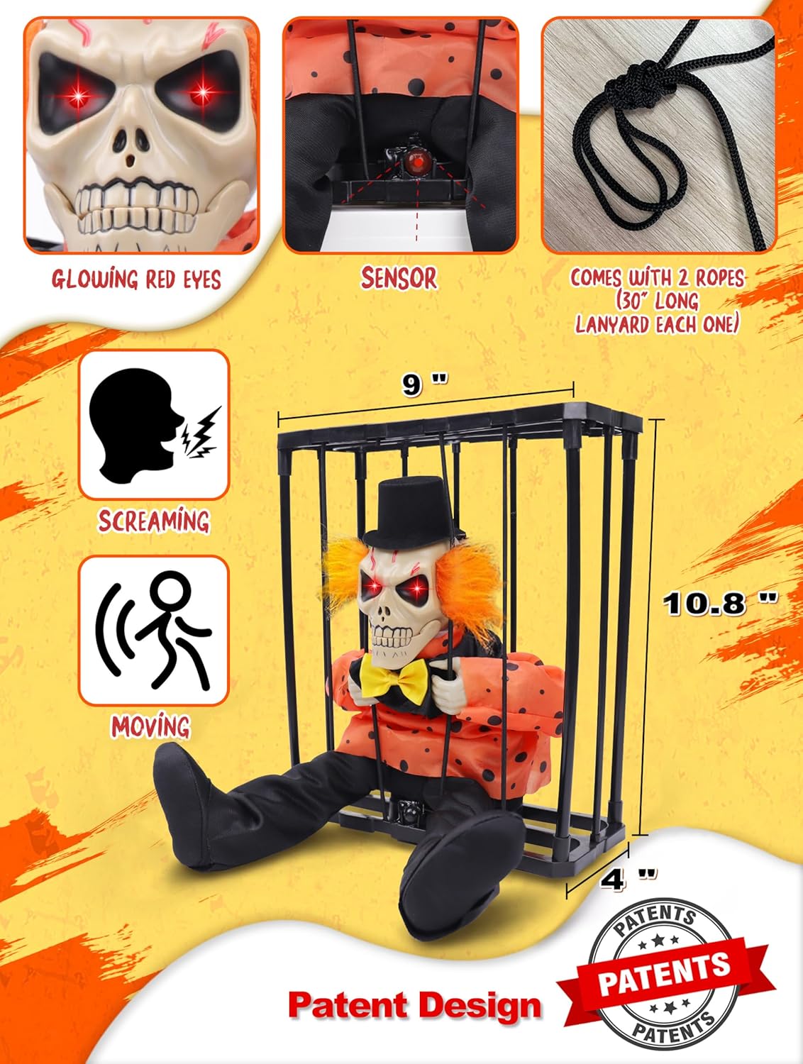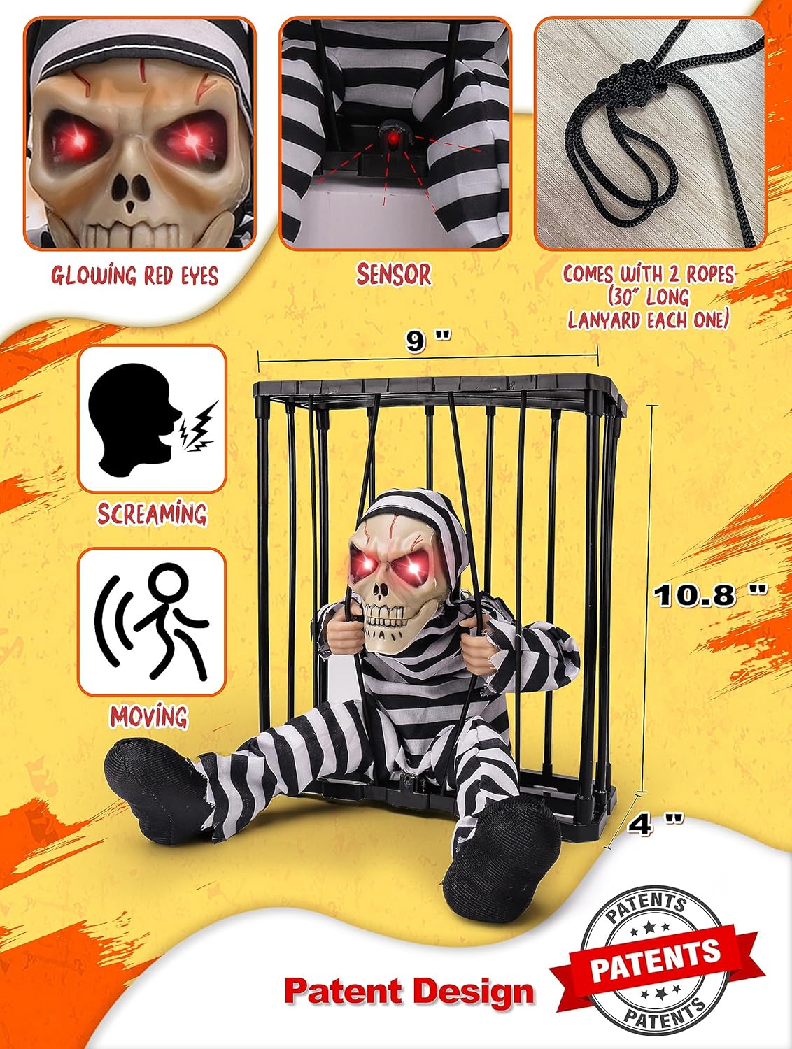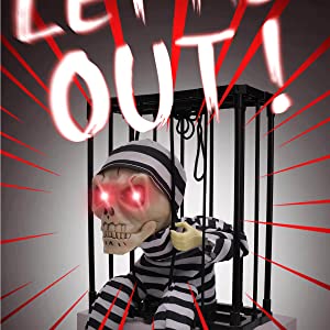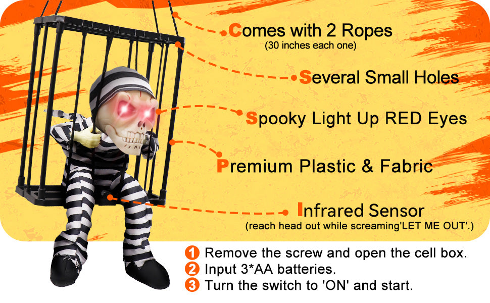 Great Quality and Sturdy-Our prison cage ghost skeleton Halloween decoration is made of high-quality premium plastic, fabric, and electronic components, it operates on 3 AA batteries (not included). Measures 9 * 4 * 10.8 inches and includes two 30-inch hanging strings, for you to easily carry the skull Halloween decoration on the back by the strings, ensuring that anyone passing behind you will be scared by the screaming Halloween animatronics with illuminated eyes.