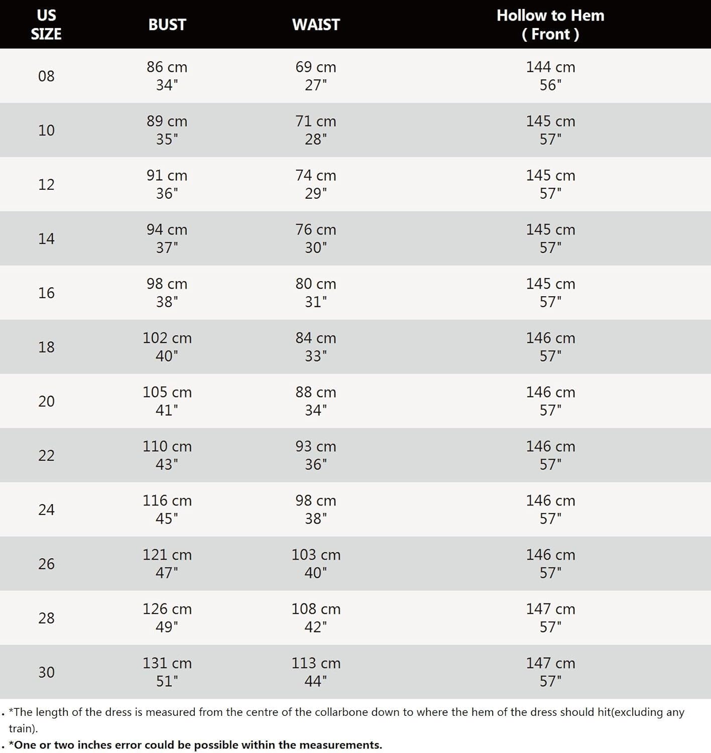 SIZE:To choose the correct size, please refer to our size chart in the pictures. When you select your dress size, the numbers displayed correspond to UK size, so make sure it’s the correct size in the chart.