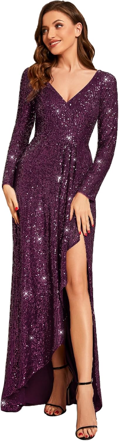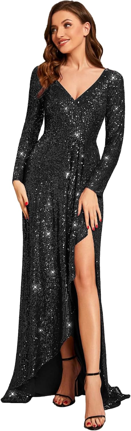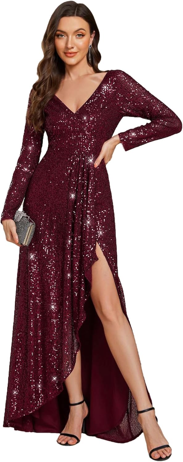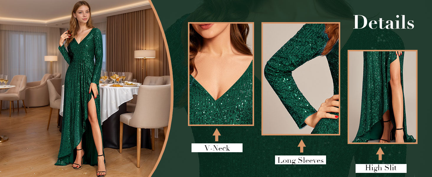 Winter Sequin Dress Long Sleeves A-Line High Low Maxi Evening Dresses 50146