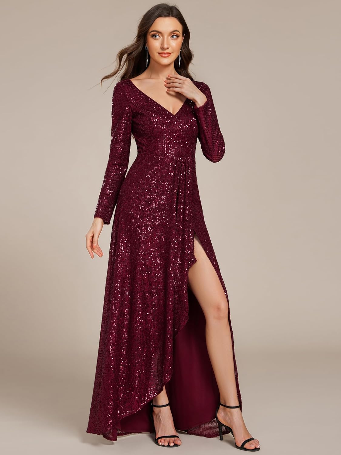 This glamorous floor-length evening dress features fitted long sleeves and a plunging cross-over v-neck collar with ruched detail. A cinched waist gives way to an asymmetrical ruffled hem with a high slit on the front, perfect for showing off your heels.